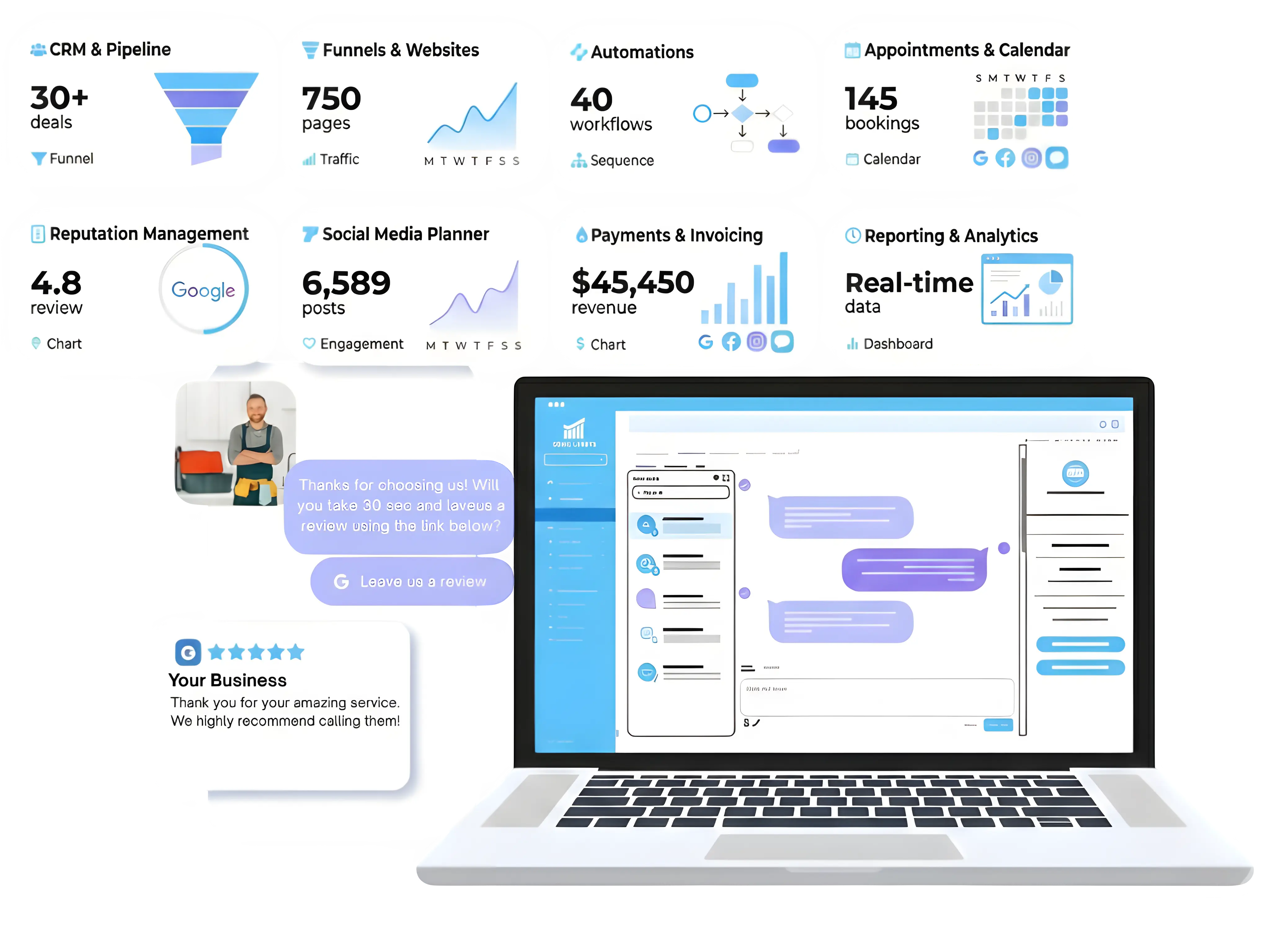 They capture leads. Respond instantly. Send missed call texts. Request Google reviews. Collect payments. And integrate directly with a CRM so every opportunity is tracked, followed up, and never lost.